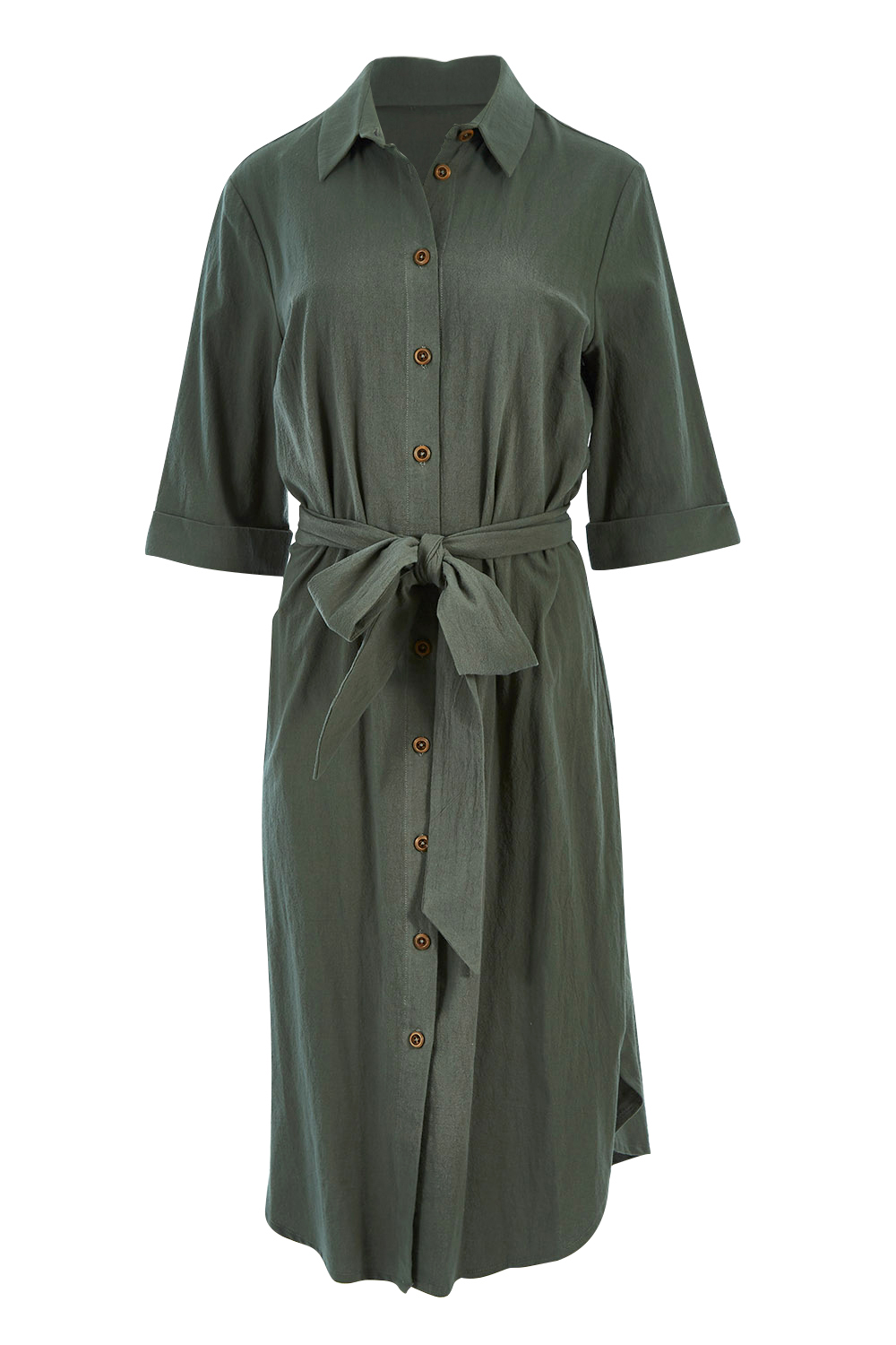 New from Belle bird, the Belle Wooden Button Dress is a versatile shirt dress using a soft khaki green in a linen viscose blend.