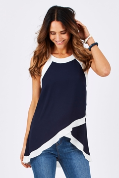 Chic, modern and cool - introducing the Crossover Cami from bird keepers. This asymmetric cami is lightweight, and has a contemporary edge with either navy or red combined with classic white.