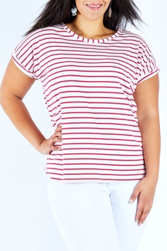Tried this t-shirt on - it's fantastic. It is actually a pink base with the red stripes. I can wear either of these colours. It will look fabulous with white shorts/long pants. The length is great - covers my bottom. It is loose fitting. Super comfortable.