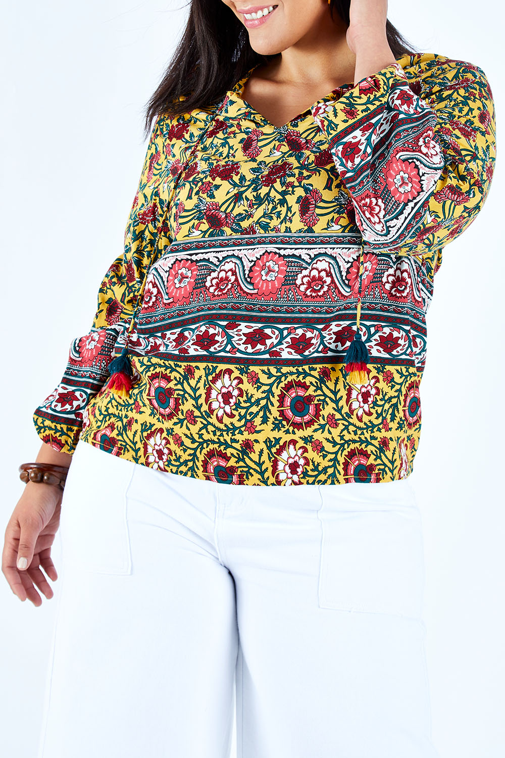 The Sun Kisses Blouse from boho bird features a gorgeous floral print, using a deep mustard, dark green and rose wood colour pallet.