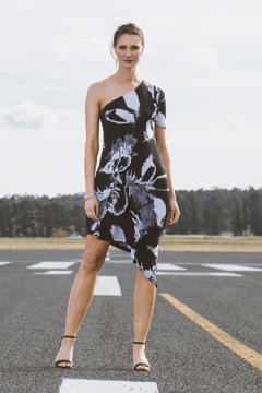 Incredibly modern the asymmetrical hem and one shoulder design is fabulously fashion forward. Coming in a monochrome black and white feathered print this dress is all kinds of elegant. The fabric is a smooth jersey fabric and comes lined. The fitted designed hugs you seamlessly showing of your beautiful figure. Pair with a black heel and silver jewellery for an outfit that will have you looking your finest! Love, Dayna and the birdsnest girls x